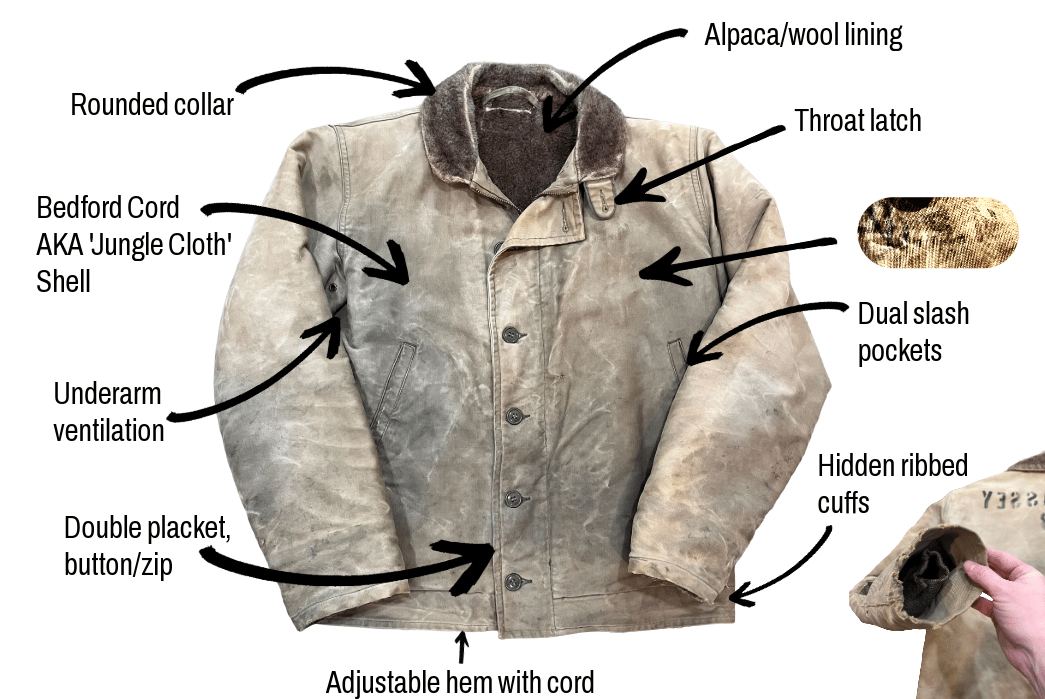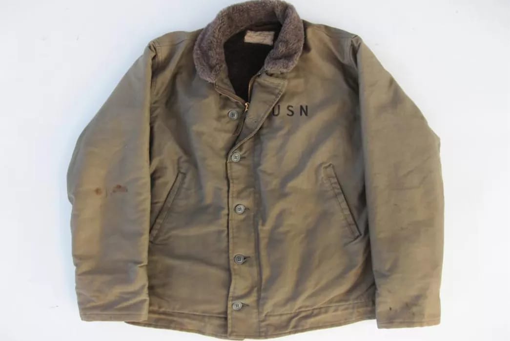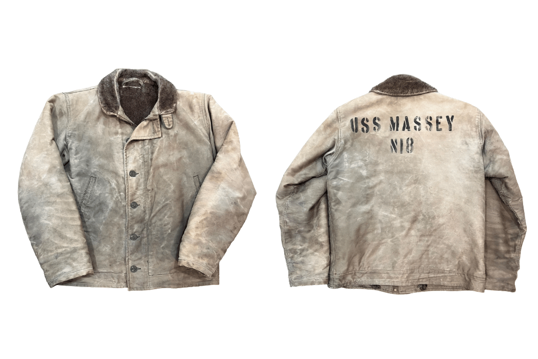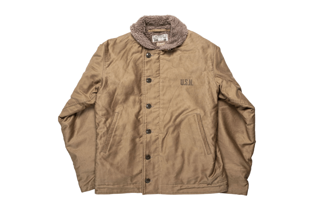 As well as providing a robust and warm shell, the Bedford cord broke in nicely to conform to the wearer’s body shape, while the alpaca/wool lining provided cozy warmth in frigid conditions. While there are no readily available anecdotes surrounding the N-1, vintage examples with custom patches and stencilling suggest that some officers cherished their deck jackets. Some evidence suggests that some sailors, including Rear Admiral A. D. Struble, onboard the command ship USS AUGUSTA, wore the N-1 during the D-Day landings in Normandy, France, on 6 June 1944.