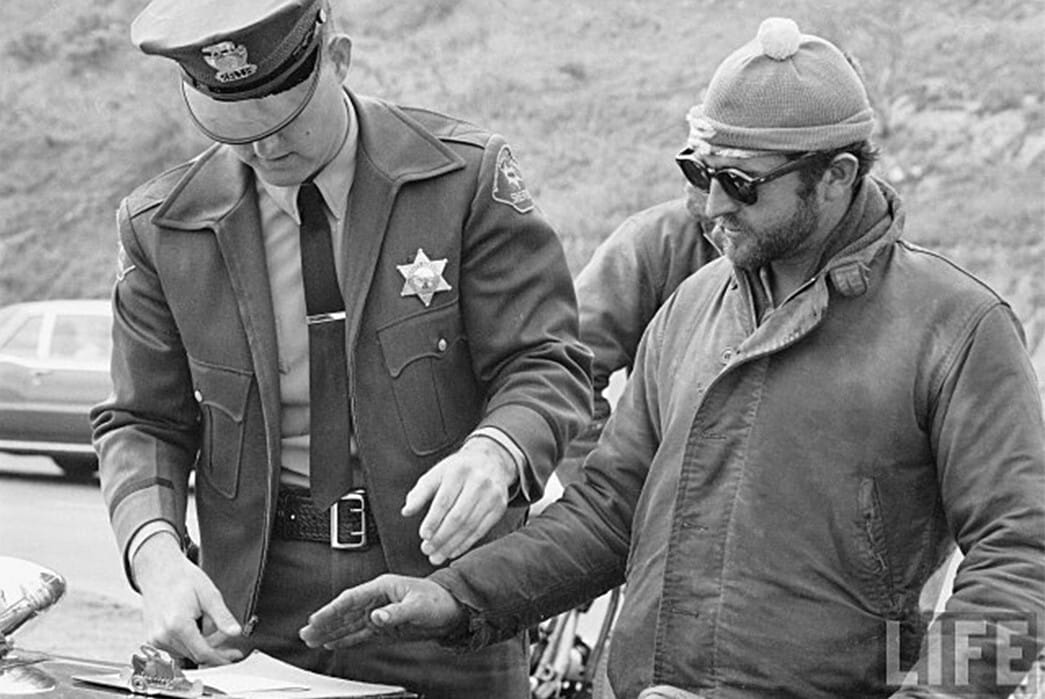 A Hell’s Angel in a N-1, Courtesy of Life Magazine. (You think he was speeding, or the cop just didn’t like the jacket paired with a pom-pom’d beanie?)