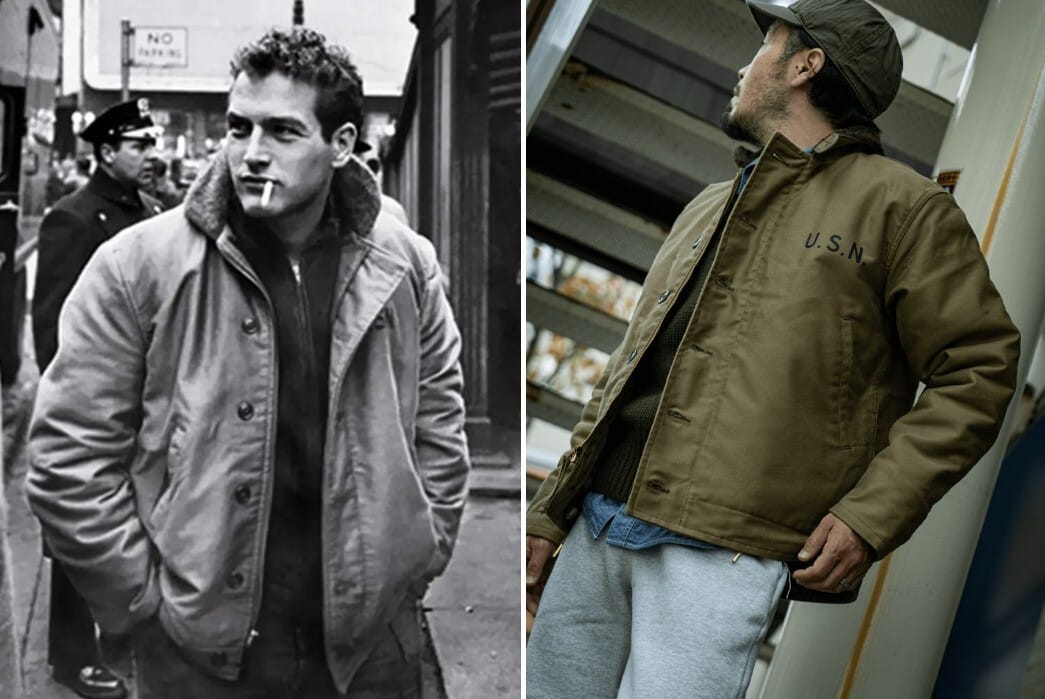 Paul Newman looking killer in an N-1 (left), and a reproduction N-1 by The Real McCoy’s being modeled, via The Real McCoy’s.