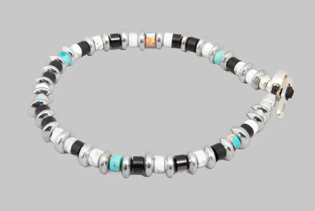 The perfect gift for the special person in your life — or just for you, you’re special too after all. The Roundel bracelet from Mikia pairs naturally silver hematite with eye-catching jet turquoise to create an ideal piece of wrist decoration.
