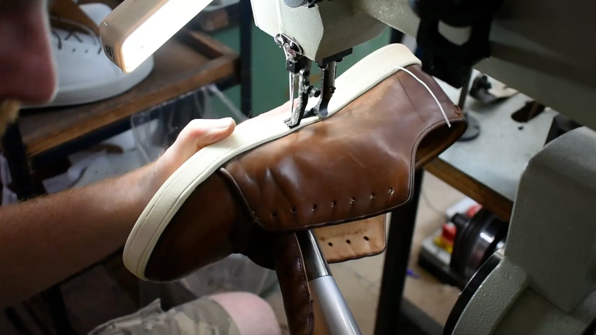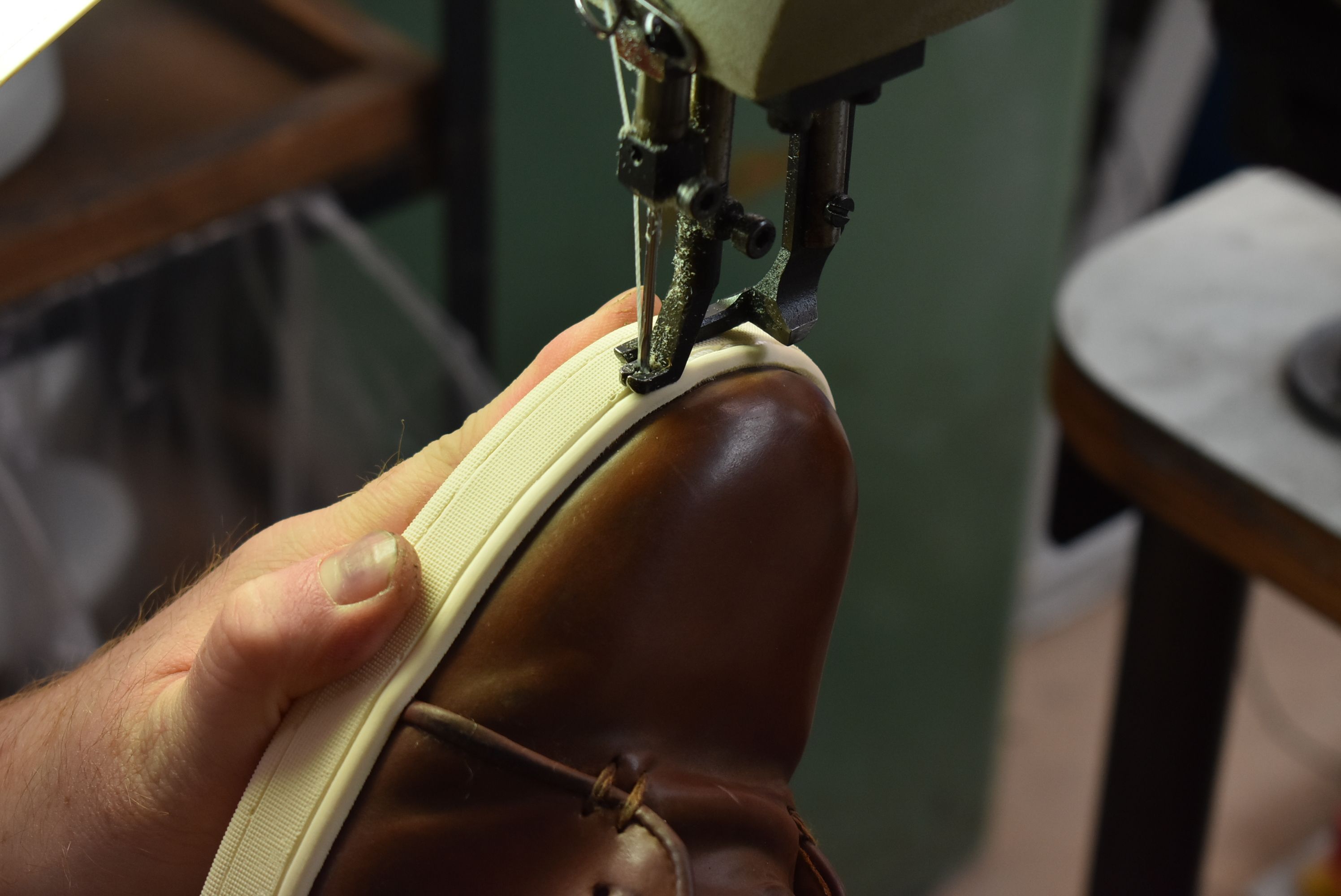 Handling the shoe at this point, it’s astounding how strong the adhesives alone are. But it’s time for stitching! At this point, Kerry sends the shoes back to Ollie.