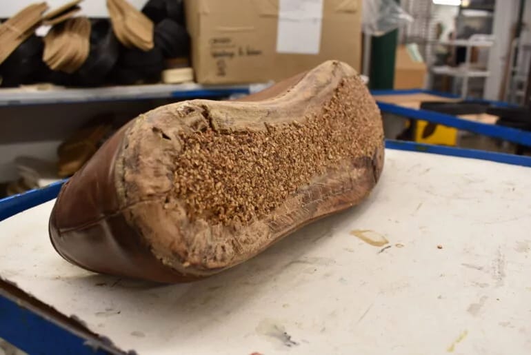 Ollie pops the sole stitching off before passing them to Kerry, who works them off with a specialized tool. Kerry also removes the old cork filling before filling them with a Springline last. Both of these processes require a fair bit of elbow grease, as both the cork and sole are applied with strong, heated adhesives during production.
