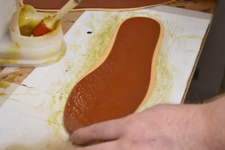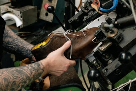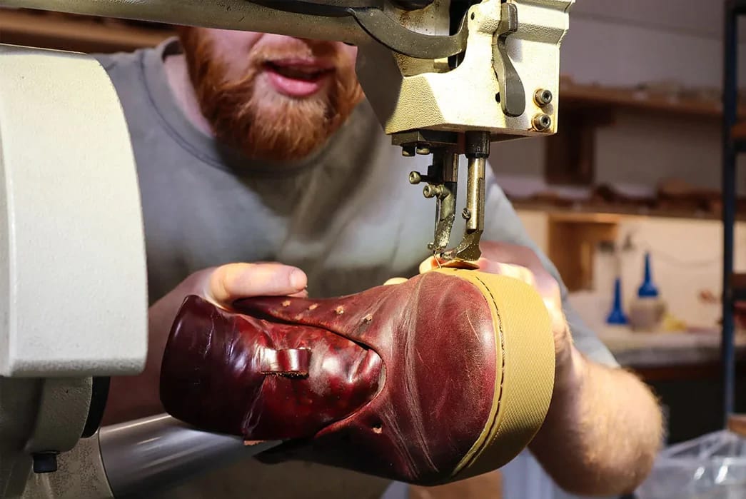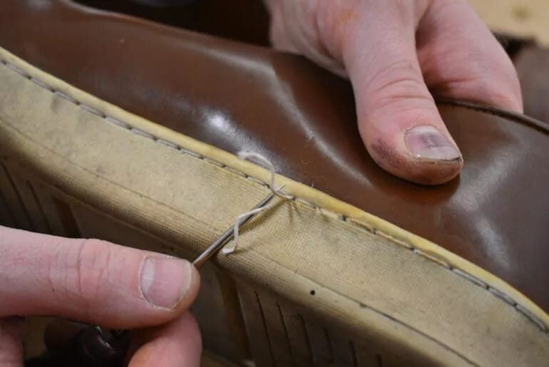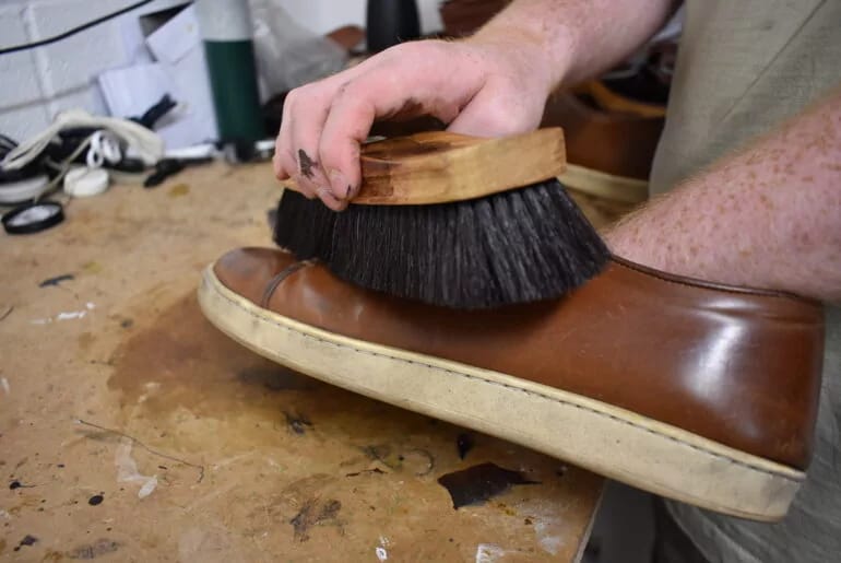 After attaching the sole with strong sidewall stitching, Ollie takes the shoes to the finishing room. He glues in new insoles, threads in new laces, and gives them a final buff with a Horse Hair brush.