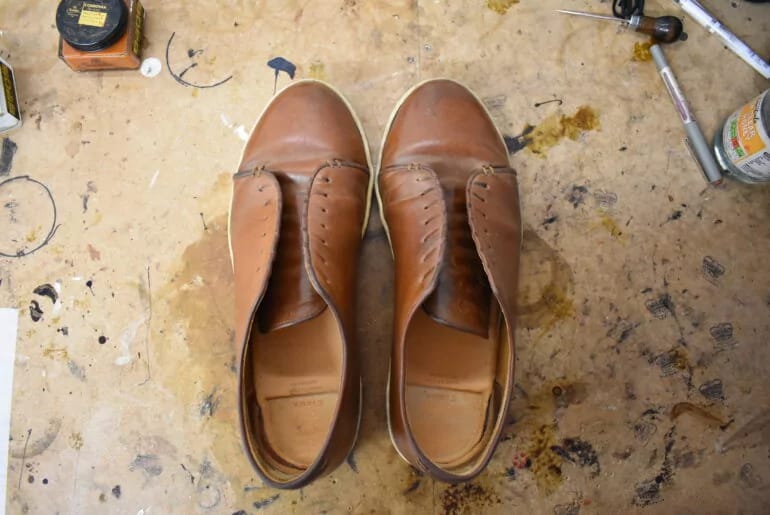 NB: if you’re wondering why the area the sole used to cover is lighter in color, that is due to skiving; a totally normal and necessary part of shoemaking. Skiving is the process of thinning leather by shaving down its underside or edge, so that the leather becomes less bulky and easier to fold, overlap, or stitch neatly.