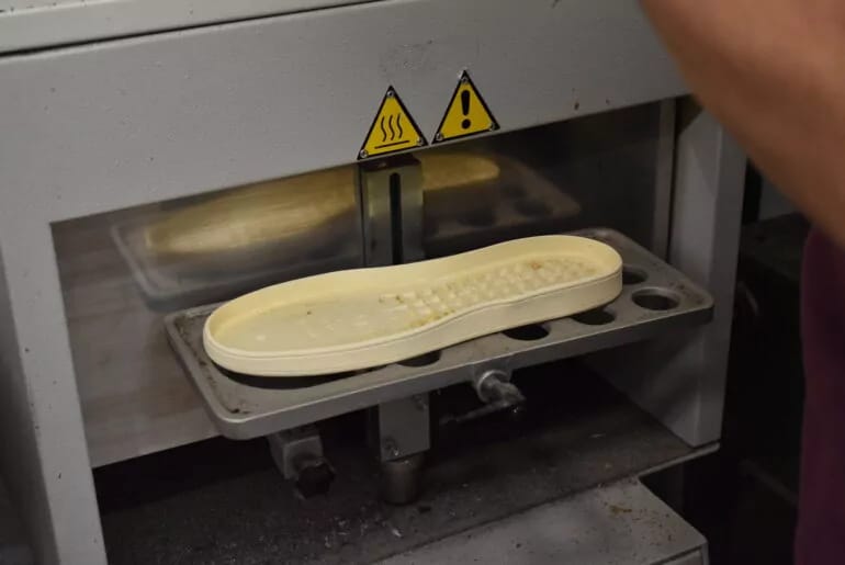 Kerry picks out a new Lacate Hevea sole and heats it up, ready to be cemented and pressed onto the upper. This occurs prior to stitching using an impressive pneumatic machine that pushes the sole on with high accuracy.