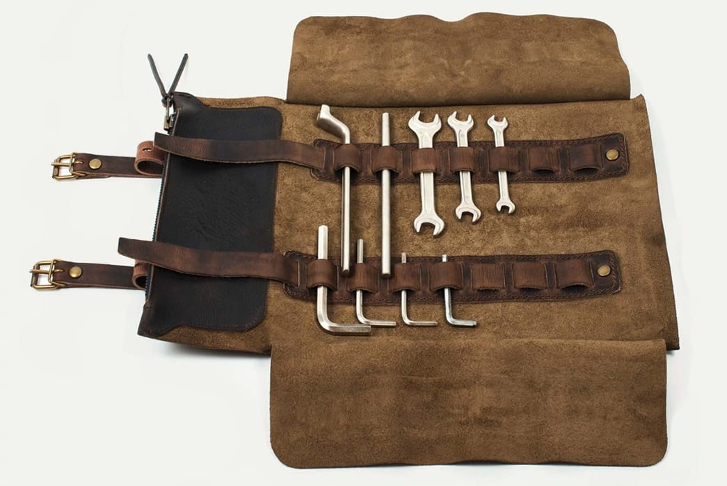 Speaking of offline essentials, a basic tool kit is a must. Bleu de Chauffe’s made tool roll is anything but basic and can hold everything you’d need to avoid throwing in the towel to AAA. It’s made from veg-tanned leather in France at their studio in Aveyron and can be affixed to your bike or just under your passenger seat.