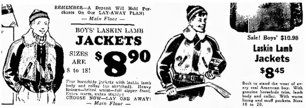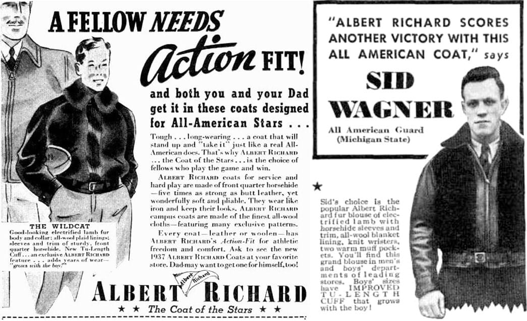The Laskin Lamb jacket enjoyed roaring success in the pre-war 1930s, peaking around 1937 before dropping off in 1938. Jacket-producer Albert Richard Company helped to skyrocket the popularity of the style by using sports stars to advertise it, citing the ease of movement achieved through affixing the insulation to the exterior of the jacket. Note the advertisement below right, which utilized American Football pro, Sid Wagner. This ad actually refers to the jacket by its first moniker ‘fur blouse’, while the advert on the left refers to it as the ‘Wildcat’, whilst citing the ‘action fit’.
