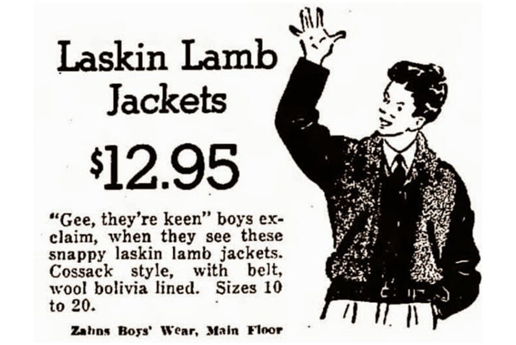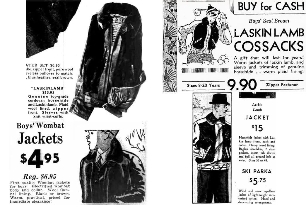 Ironically, the Grizzly was not known as the Grizzly Jacket until the late 20th century. To my knowledge, it’s a moniker coined by vintage collectors and enthusiasts to encompass the styles discussed in this article. The most common name for the Grizzly during its 1930s heyday was the ‘Laskin Lamb’. This name is actually the name given to the mouton (sheepskin cut and sheered to resemble beaver fur) product used on the outside jackets and the collar. Other trade names for mouton were around in the industry, such as Beavertex and American Wombat (one image in Dave Himel’s archive even refers to ‘Electrified Wombat’) — but Laskin Lamb is what stuck — so much so, that this is how the Grizzly style was referred to by practically all makers during the 1930s.