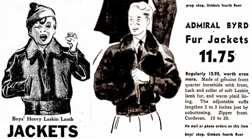 While King-O-Fur’s earlier Grizzlys featured real fur, makers like Admiral Byrd, Albert Richard, and others pioneered the use of mouton during the 1930s. The collection of vintage advert clippings sourced from Himel’s Vintage Leather Jackets Blog shows the range of makers and just how solidified the mouton silhouette became (pictured above and below) became.