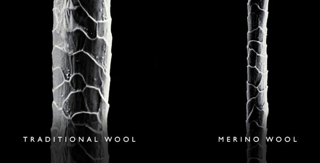 Merino wool fibers are much finer than regular wool fibers, typically ranging from 15 – 24 microns in diameter compared to the 30-40 microns of generic wool. As well as making the fibers lighter, this also makes the ‘scales’ on the outer cuticle layer of the fibers smaller, reducing friction and making merino wool softer and far less itchy than traditional wool. On performance wear like a base layer, this also reduces chafing.
